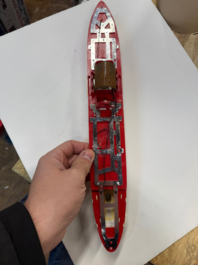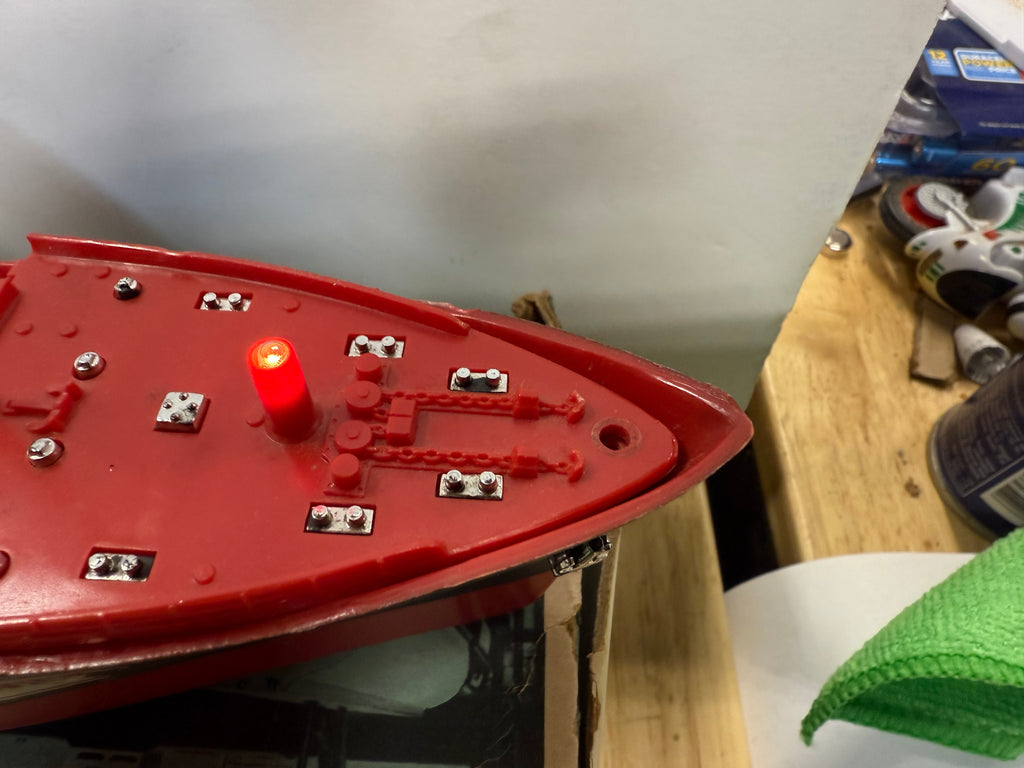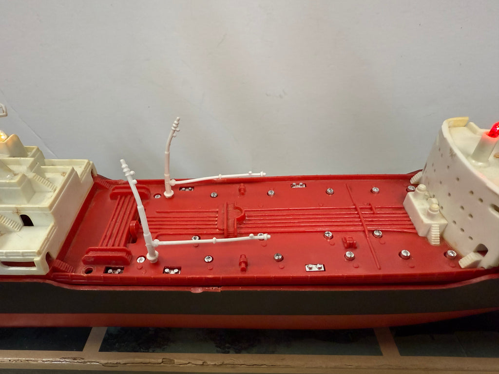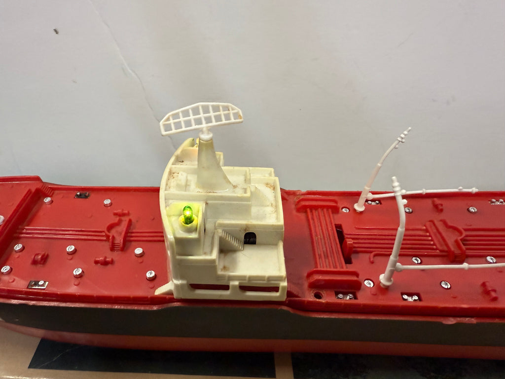 The lights on the ship are in working condition and battery terminal is clean. The deck pieces are included as well. The top and bottom to the box is included. The box has aged and is stained as seen in the pictures. Decals are factory Original