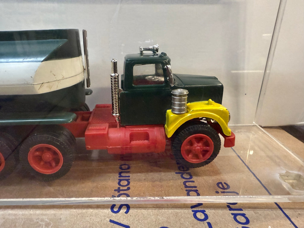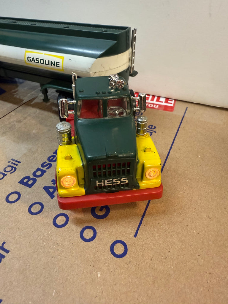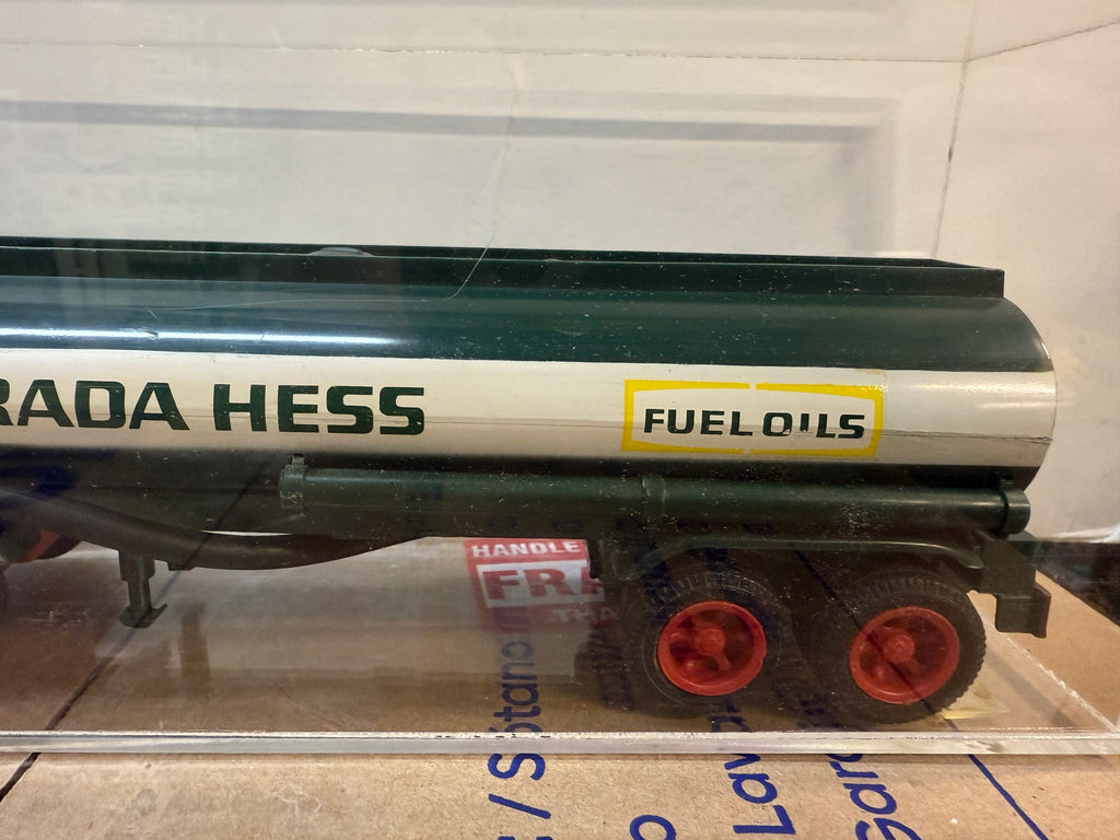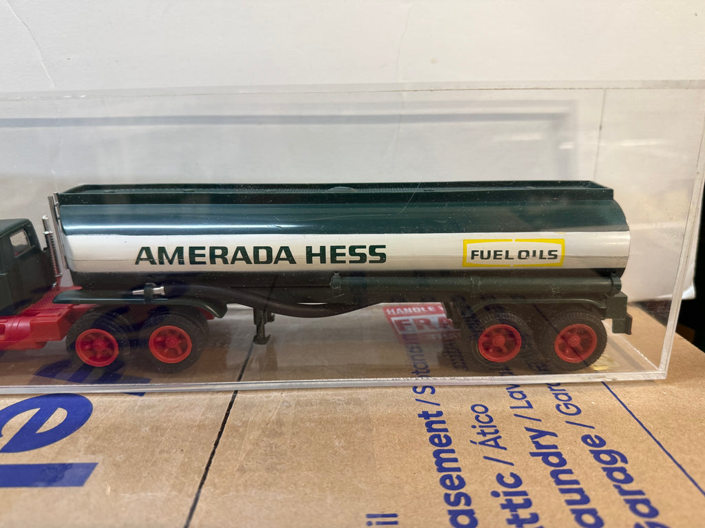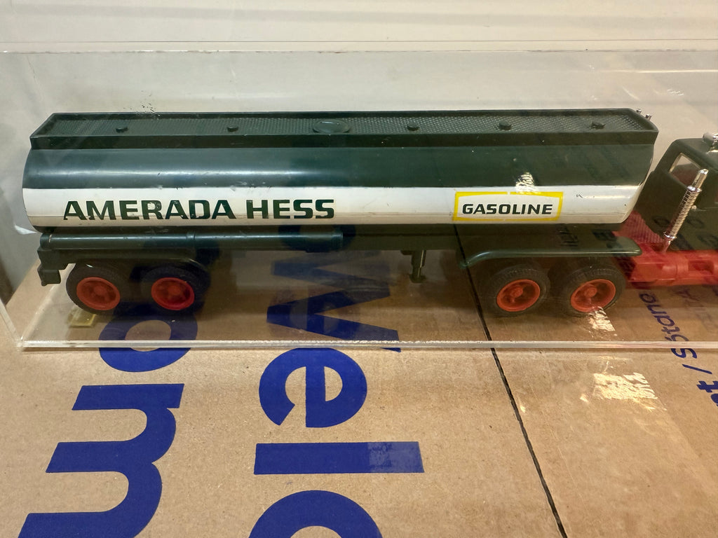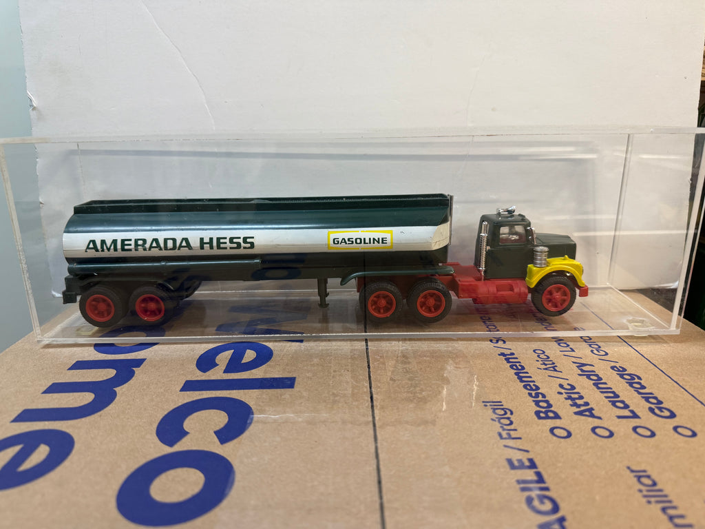 You are purchasing a beautiful condition 1969 Amerada Hess Tanker truck with display. As you can see in the pictures, the tanker truck is in immaculate condition with the details being original and visible. The tanker lights do work in the front and rear with the switch as they should. The battery terminal is clean as seen in the pictures. The box is not included with this sale. The display case was custom-made for this tanker truck.