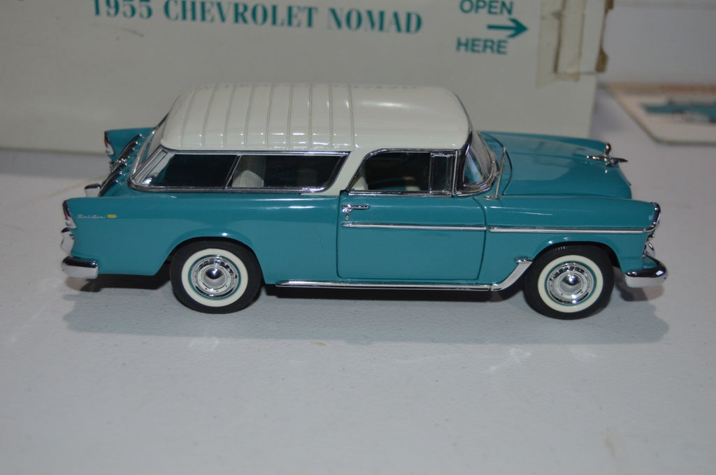 Danbury Mint 1:24 Scale 1955 Chevrolet Nomad Blue / White Top Diecast w/ TitleAs with all Danbury Mint cars, this car has amazing detail, opening hood, tailgate, and doors.Original box and packing material.